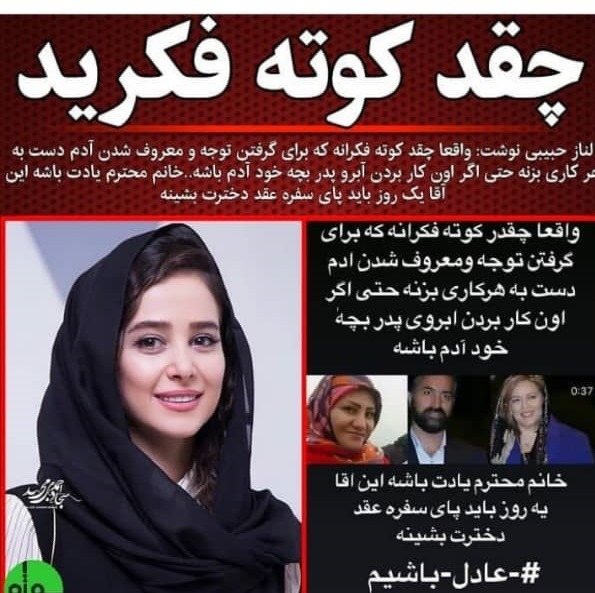 الناز حبیبی یکی دیگر از بازیگرانی بود که به این حواشی واکنش نشان داد و در دفاع از همکار خود نوشت: واقعا چقدر کوته فکرانه که برای گرفتن توجه و معروف شدن آدم دست به هر کاری بزنه. حتی اگه اون کار بردن آبروی بچه خودم آدم باشه. خانم محترم یادت باشه این آقا یک روز باید پای سفره عقد دخترت بشینه.