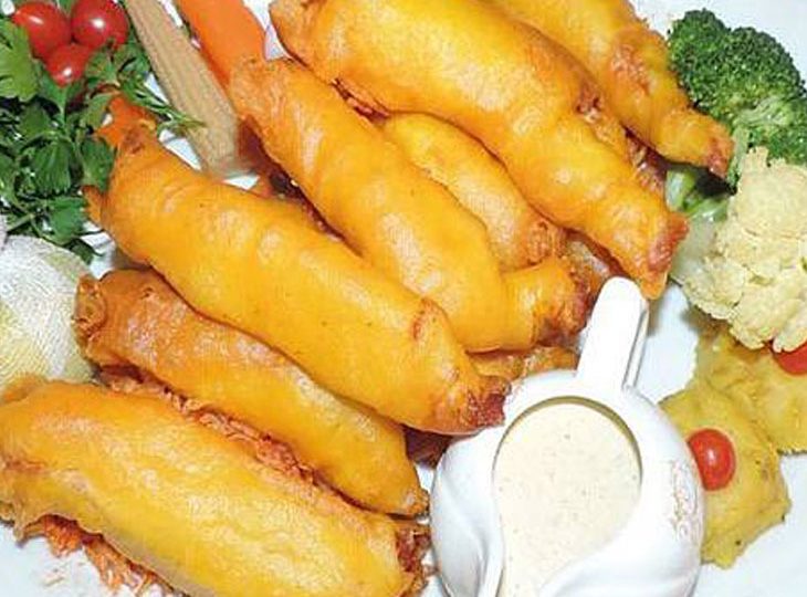 اگر خمیر اضافه ماند میتوانید پیازهایی که داخل مرغ حلقه کرده و آن را پخته بودید را در مابقی خمیر بغلتانید و آن را نیز سرخ کنید.