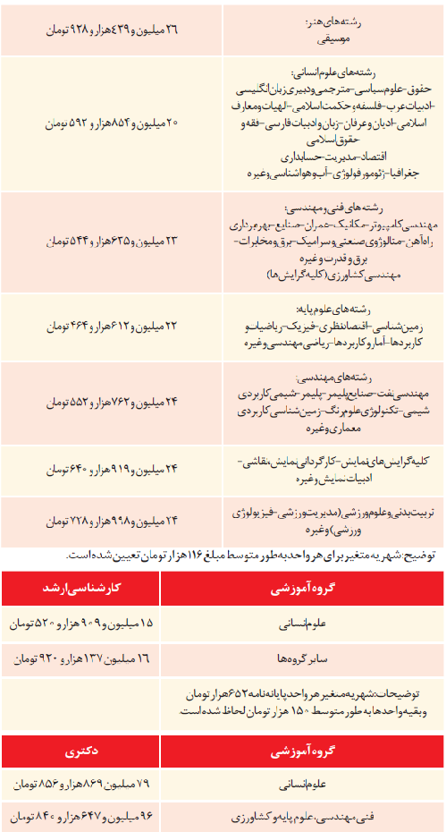 در ادامه، حداقل شهریهای که دانشجویان کارشناسی، ارشد و دکترا باید برای تحصیل و دریافت مدرک در این دانشگاه پرداخت کنند، بررسی شده است.