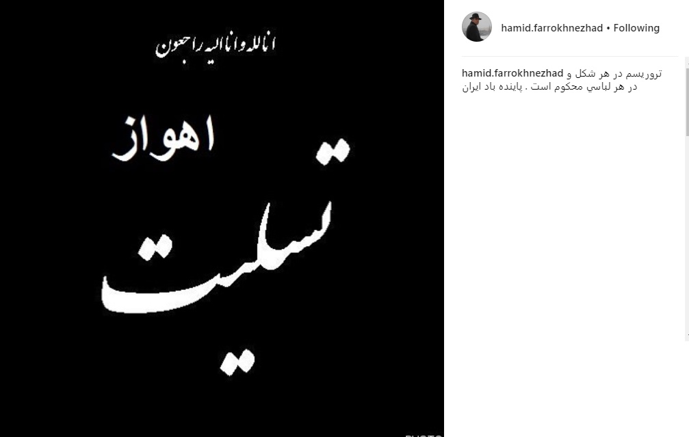 حمید فرخنژاد نیز این اتفاق تلخ را به مردم اهواز تسلیت گفت و نوشت: «تروریسم به هر شکل و در هر لباسی محکوم است، پاینده باد ایران.»