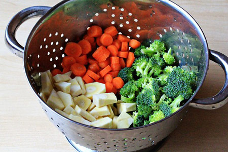 بهتر است فقط هویج و ساقه کرفس و پیازچه خرد شود و مابقی را دست نخورده به آب اضافه کنیم و روی دمای ملایم به مدت یک ساعت بجوشانیم.