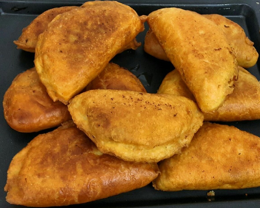 خمیرها را به نوبت کف دست تان گرد و پهن کنید و مقداری از مایه سیب زمینی داخل خمیر بگذارید.