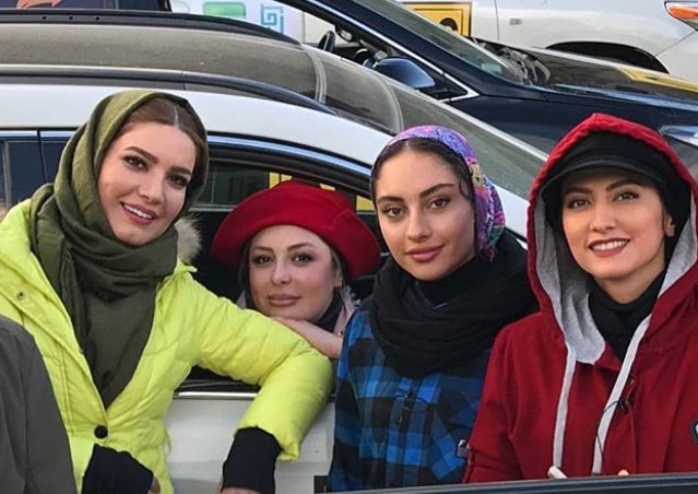 دوات آنلاین-نیوشا ضیغمی، متین ستوده، سمیرا حسینی و ترلانه پروانه کنار چند ماشین ایستاده و عکس یادگاری گرفتهاند. این عکس را ببینید: