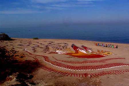 فراموش نكنید؛ «خاك» یكی از دیدنیهای هرمز است؛ ذره ذره خاكش، تركیب افق، ساحل رنگی و نقش خلیجفارس؛ وقتی كه میگوییم نقرهای و طلایی و سرخ، فقط واژه است، نقرهای خود طیفی میشود كه با رنگ آفتاب بازی میكند، گاهی كمرنگتر و گاهی پررنگتر، گاهی از فرط روشنایی به رنگ آسمانها نزدیك میشود و گاهی از فرط تیرگی گویی میشود ذرهای از دل شب كه نور مهتاب بر آن میتابد.بقیه رنگها نیز همین است، خاك سرخ فقط یك تمثیل است تا تو را به دنیای آرزوها و دنیای رنگها ببرد. خاك است و آفتاب و رنگ، آنقدر پرتلالو كه نقش خیال میزند و بسیاری كه نقش هنر در ذهن دارند، در مناسبتهای مختلف بر ساحل این جزیره گردهم میآیند و فرشی از خاك با طرحهای بكر ترسیم میكنند. حدود 3 سال پیاپی است كه به مناسبتهای مختلف فرش خاكی هرمز كه با استفاده از خاكهای رنگارنگ جزیره ترسیم میشود، بهانهای است تا هنرمندان گردهم آیند و نقش خاك را بر دل زمین بزنند. زمان برگزاری دقیق این مراسم همه?ساله مشخص نیست، ولی اصولا در نیمه دوم سال كه بیشتر فصل سفر به جنوب است و یا در اردیبهشت ماه به مناسبت روز ملی خلیجفارس این برنامه تكرار میشود.