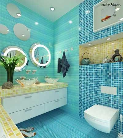 فیروزهای تداعی کننده آب است، بنابراین برای دکوراسیون سرویس بهداشتی مناسب است. میتوان از کاشیهای فیروزهای برای دیوارپوش و کف پوش استفاده کرد و یا در وسایل جانبی سرویس بهداشتی از این رنگ استفاده کرد.