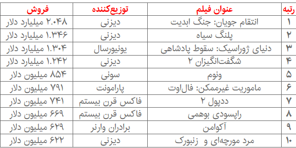 دوات آنلاین-خیلی طبیعی است که هیچ کس نمیتواند تمام فیلمهایی را که تولید و پخش میشود تماشا کند برای همین میتوان از فهرستهایی مانند پرفروشها برای انتخاب فیلم کمک گرفت. در ادامه فهرست 10 فیلم پرفروش سال 2018 را مطالعه میکنید: