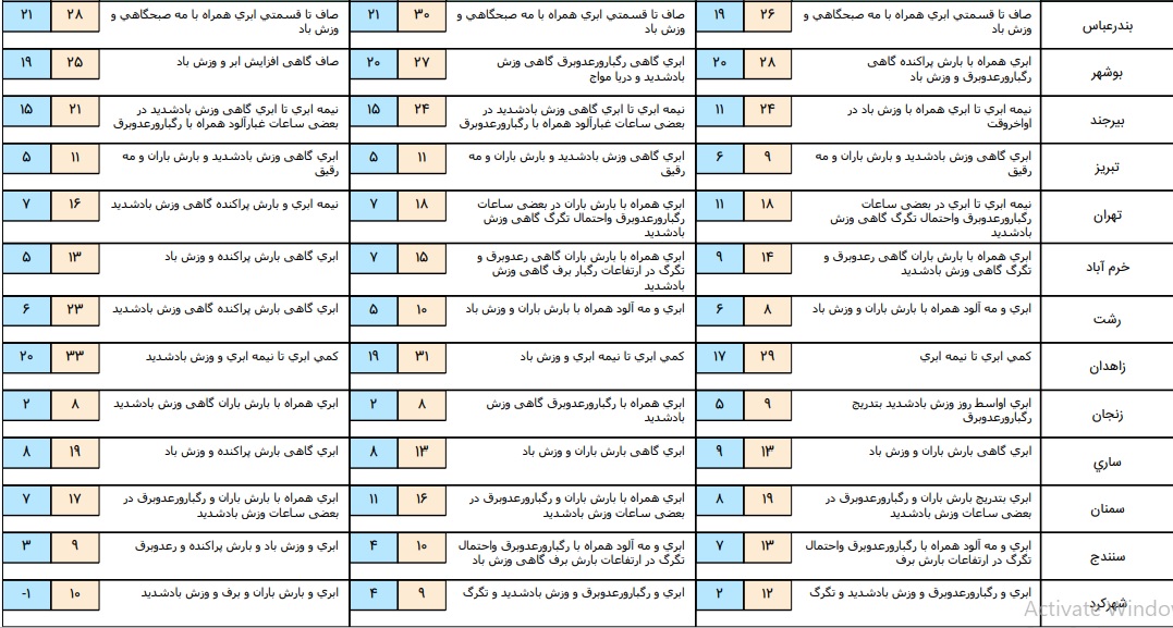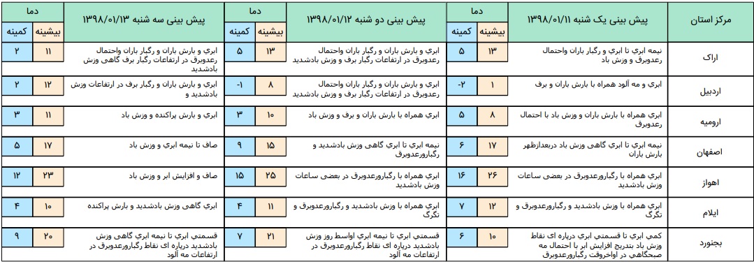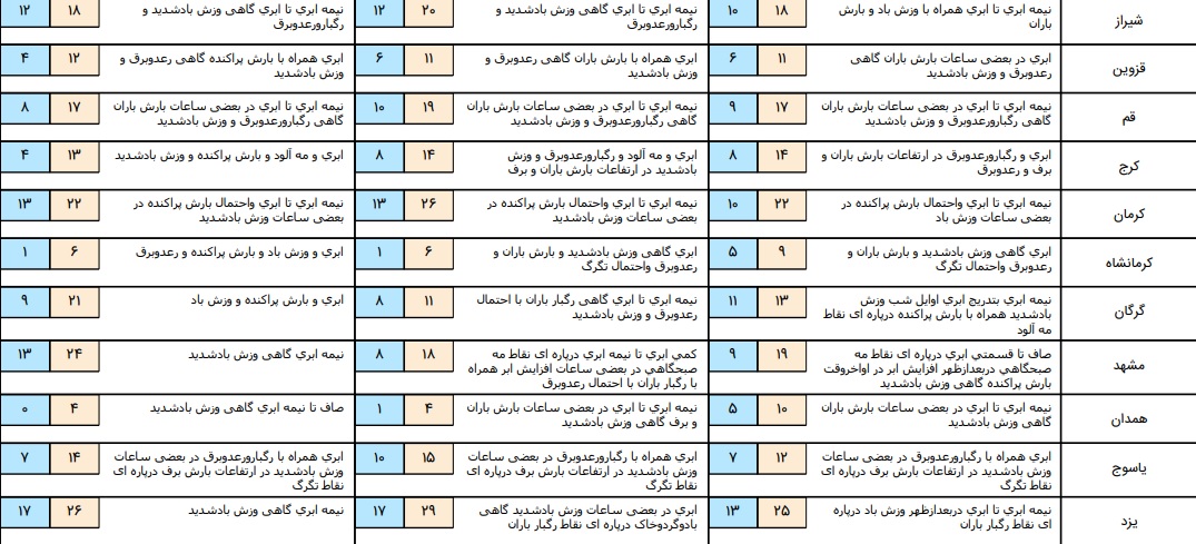 دوات آنلاین-جدول پیشبینی وضعیت آب و هوا در سراسر ایران طی روزهای یکشنبه(امروز) ، دوشنبه و سهشنبه 13 فروردین را ببینید و بعد از آن برای رفتن به سفر یا تفریح تصمیم بگیرید: