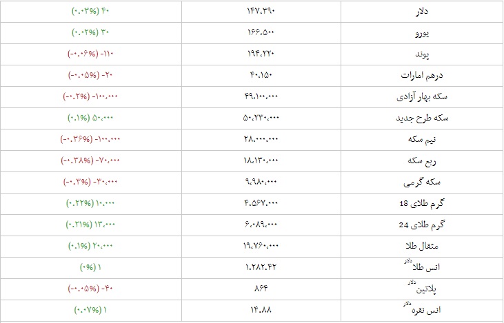 دوات آنلاین-قیمت دلار، یورو و ارزهای دیگر به همراه قیمت انواع سکه و طلا در جدول آمده است.
