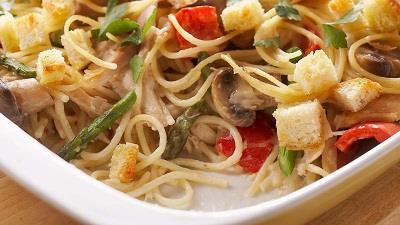 ۱. فر را با دمای ۳۵۰ درجه فارنهایت گرم کنید. استخوانهای مرغ را خارج کنید و گوشت آن را کنار بگذارید. آنها را خرد کنید تا ۳ پیمانه مرغ پخته شده به دست بیاید. در قابلمه، اسپاگتی را طبق دستور بپزید و آبکش کنید. یک دقیقه پیش از آبکش کردن مارچوبهها را اضافه کنید. سپس همه را داخل قابلمه بریزید. در یک تابه بزرگ، قارچها و فلفلهای دلمهای را با حرارت ملایم حدود ۸ تا ۱۰ دقیقه تفت دهید.