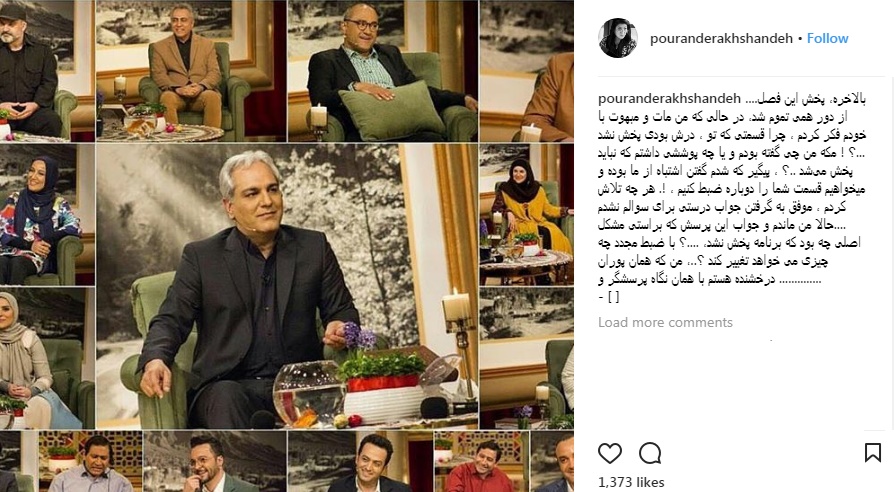 «بالاخره، پخش این فصل از دورهمی تموم شد، در حالی که من مات و مبهوت با خودم فکر کردم، چرا قسمتی که تو، درش بودی پخش نشد...؟! مگه من چی گفته بودم و یا چه پوششی داشتم که نباید پخش میشد...؟ پیگیر که شدم گفتن اشتباه از ما بوده و میخواهیم قسمت شما را دوباره ضبط کنیم! هر چه تلاش کردم، موفق به گرفتن جواب درستی برای سوالم نشدم ....حالا من ماندم و جواب این پرسش که به راستی مشکل اصلی چه بود که برنامه پخش نشد....؟ با ضبط مجدد چه چیزی میخواهد تغییر کند...؟ من که همان پوران درخشنده هستم با همان نگاه پرسشگر و...»