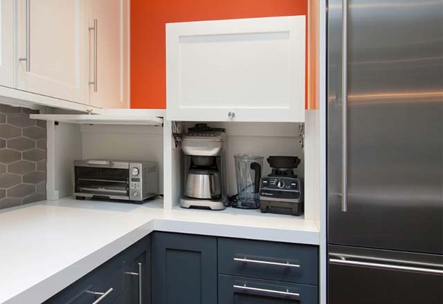 اگر روی کابینت های شما پر از وسایل برقی باشد آشپزخانه شما بی نظم تر و شلوغ تر دیده می شود.برای پنهان کردن وسایل برقی مانند قهوه جوش ،ماکروفر ،و … کابینت های در دار تعبیه کنید و بدین ترتیب آن ها را پنهان کنید.