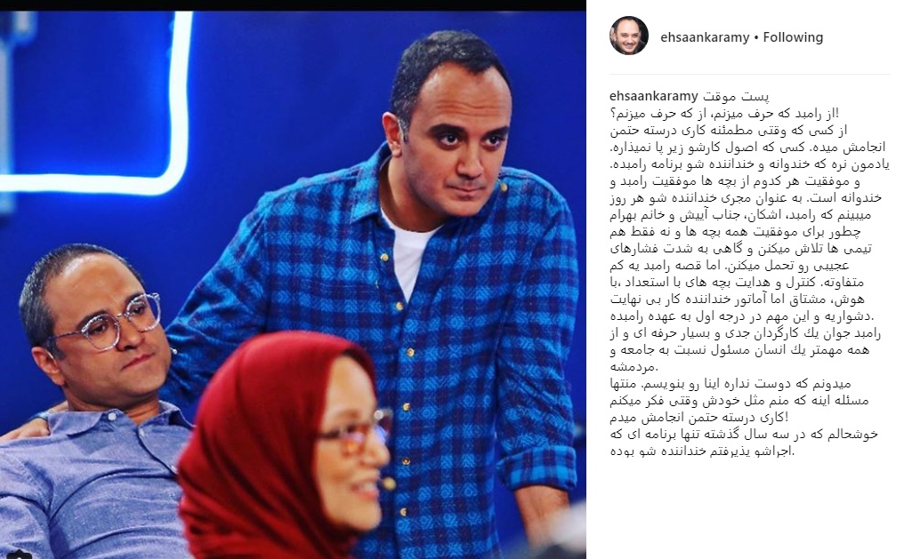 احسان کرمی، مجری تلویزیون و بازیگر که این روزها اجرای مسابقه «خنداننده شو» در برنامه «خندوانه» را برعهده دارد درباره رامبد جوان در اینستاگرام نوشت: «از رامبد كه حرف ميزنم، از كه حرف ميزنم؟!