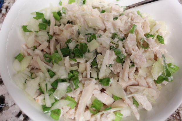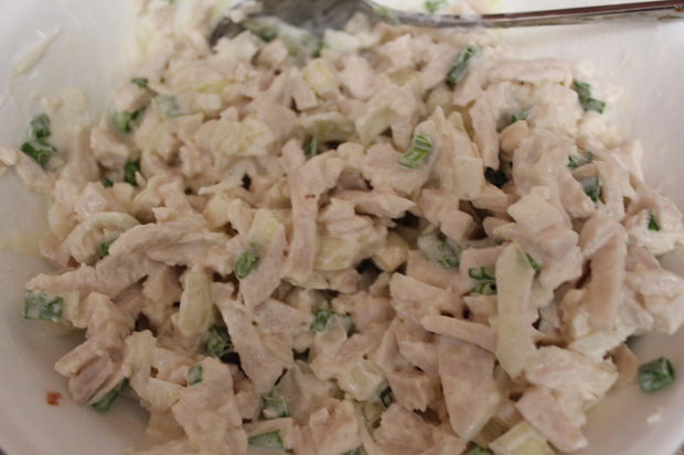 مرغ خرد شده را با بقیه مواد یعنی کرفس پخته شده، هویج پخته شده، تخم مرغ، پیاز، پیازچه، ذرت پخته یا کنسروی ،سس مایونز، ماست و پنیر ، سرکه، نمک و فلفل کاملا مخلوط کنید.