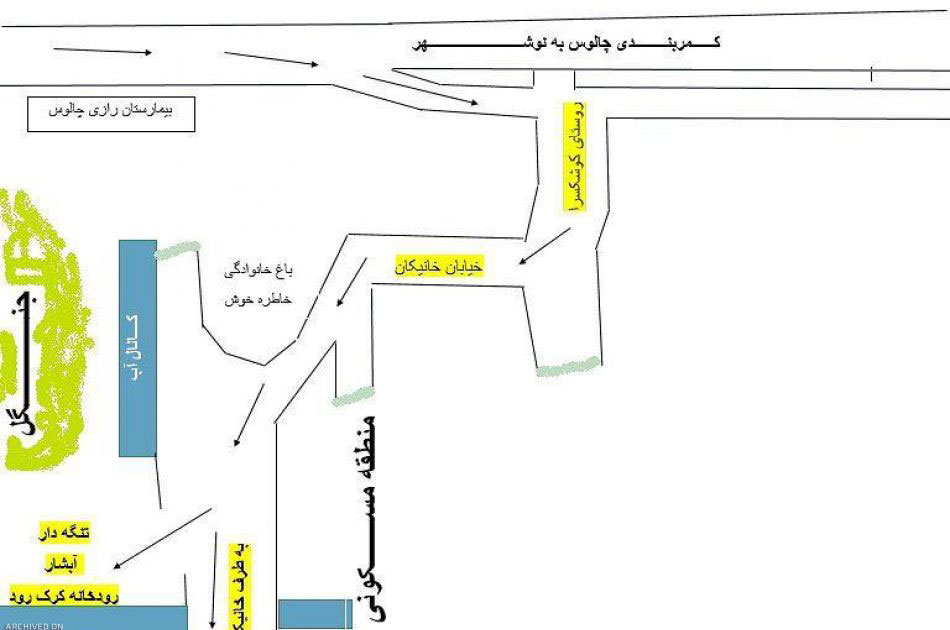 (در كمربندي چالوس به نوشهر دهكده توريستي كوشكسرا، خیابان خانيكان به رود خانه وصل می شوید.)