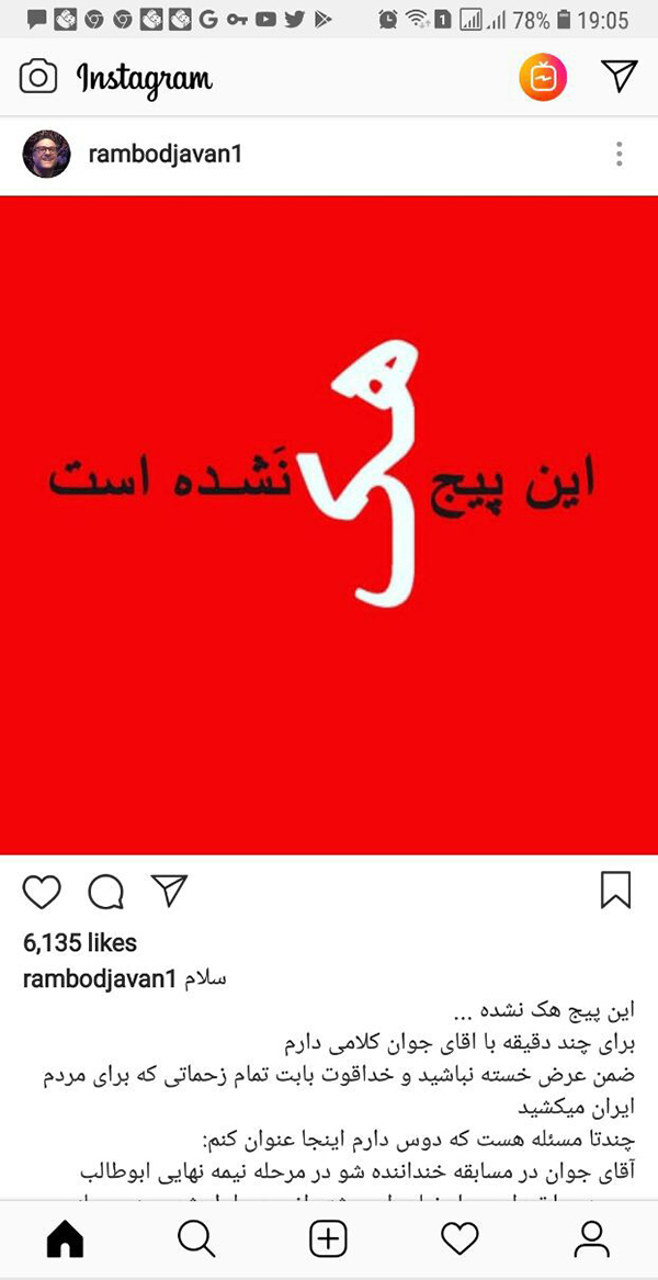 دوات آنلاین-فردی ناشناس با هک کردن صفحه اینستاگرام رامبد جوان از ابوطالب حسینی حمایت کرد.