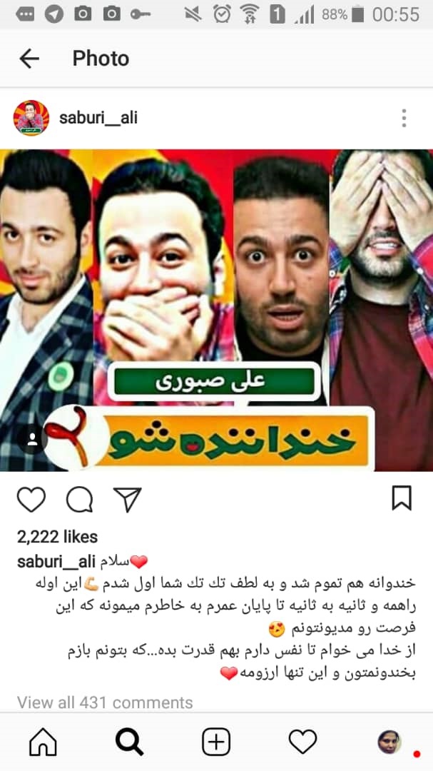 علی صبوری در واکنش به قهرمانی اش در اینستاگرام نوشت: سلام خندوانه هم تمام شد و به لطف تک تک شما اول شدم. این اول راهمه و ثانیه به ثانیه تا پایان عمرم به خاطرم میمونه که این فرصت را مدیونتونم. از خدا میخوام تا نفس دارم بهم قدرت بده که بتونم بازم بخندونمتون و این تنها آرزومه.