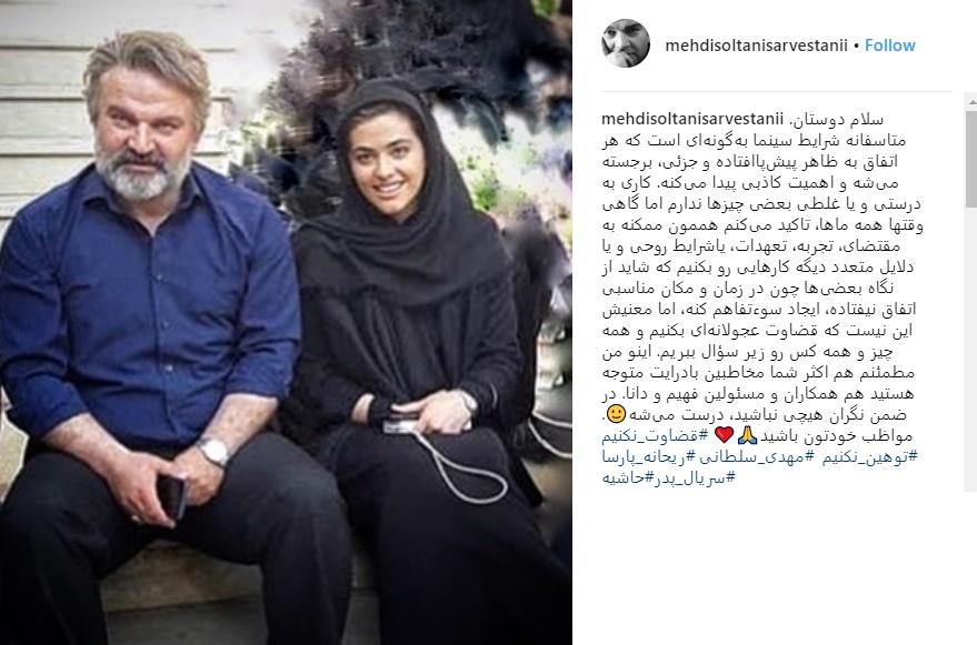 مهدی سلطانی با انتشار تصویری از خود در کنار ریحانه پارسا، بازیگر نقش لیلا در سریال پدر در اینستاگرام نوشت: «سلام دوستان. متاسفانه شرایط سینما بهگونهای است که هر اتفاق به ظاهر پیشپاافتاده و جزئی، برجسته میشه و اهمیت کاذبی پیدا میکنه.